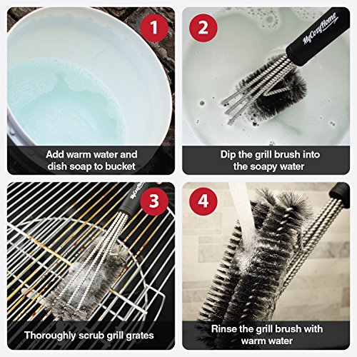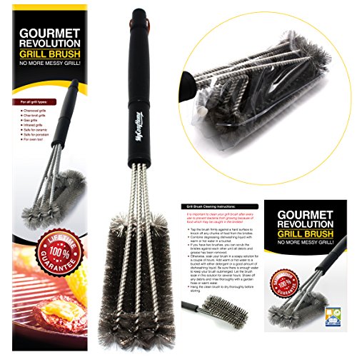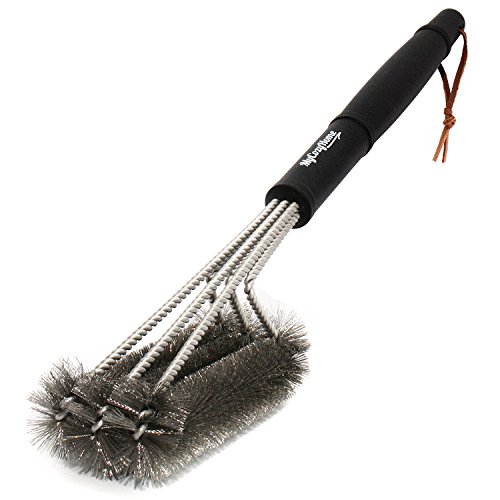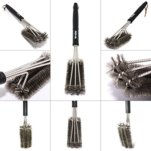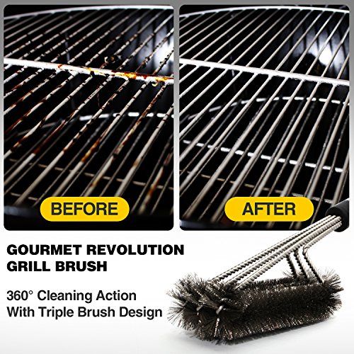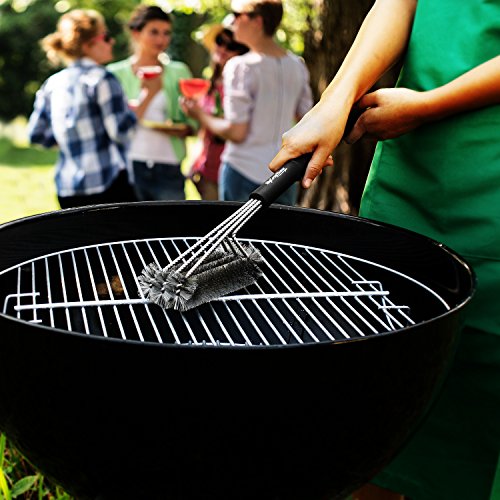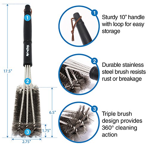 - EFFORTLESS CLEANING - Unique triple brush design provides 360° cleaning action. Clean the top, bottom, and sides of your grill grates simultaneously! And hard to reach areas are never a problem with this 17.5” brush.