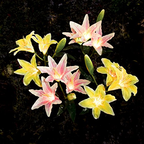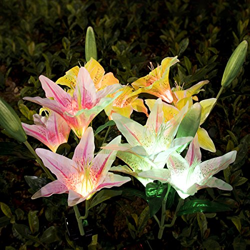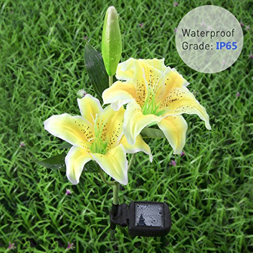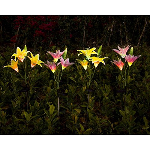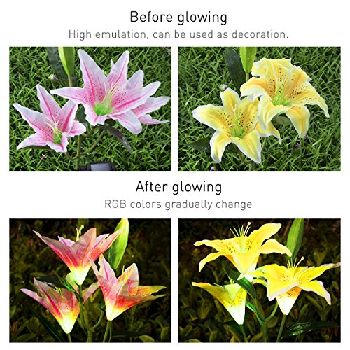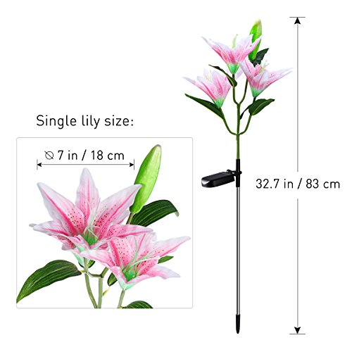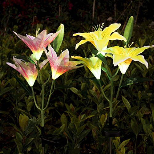 - THE PRETTIEST LILY FLOWER SOLAR LIGHTS! 30 inch tall, 2 pack RGB color changing solar powered stake lights in the shape of beautiful lily flowers, include 3 pink lily flowers and 3 yellow lily flowers.