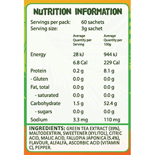 -. Feature : Stimulate metabolism, promote a weight loss detox, assist weight maintenance, help burn body fat / Boost energy, detox and helps cleanse liver & kidney / Improve & regulates cholesterol levels / Only 10 calories per serve / No Preservatives, Naturally Flavoured, Gluten Free, Low GI, Low Sugar and Aspartame Free. Sweetened with Xylitol