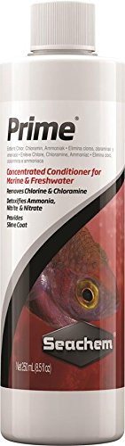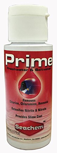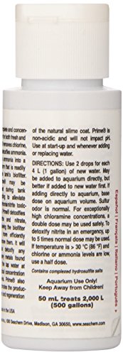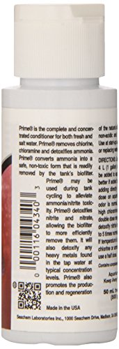 Prime is the complete and concentrated conditioner for both fresh and salt water. Prime removes chlorine, chloramine and ammonia. Prime converts ammonia into a safe, non-toxic form that is readily removed by the tank's biofilter. Prime may be used during tank cycling to alleviate ammonia/nitrite toxicity. Prime detoxifies nitrite and nitrate, allowing the biofilter to more efficiently remove them. Prime also promotes the production and regeneration of the natural slime coat. Prime is non-acidic and will not impact pH. Prime will not overactivate skimmers. Use at start-up and whenever adding or replacing water.Feature