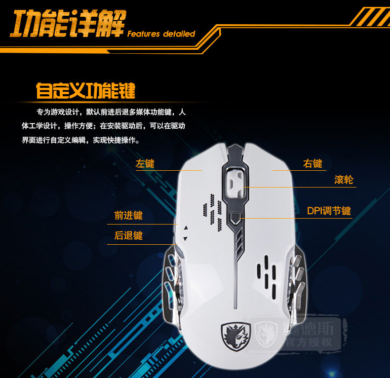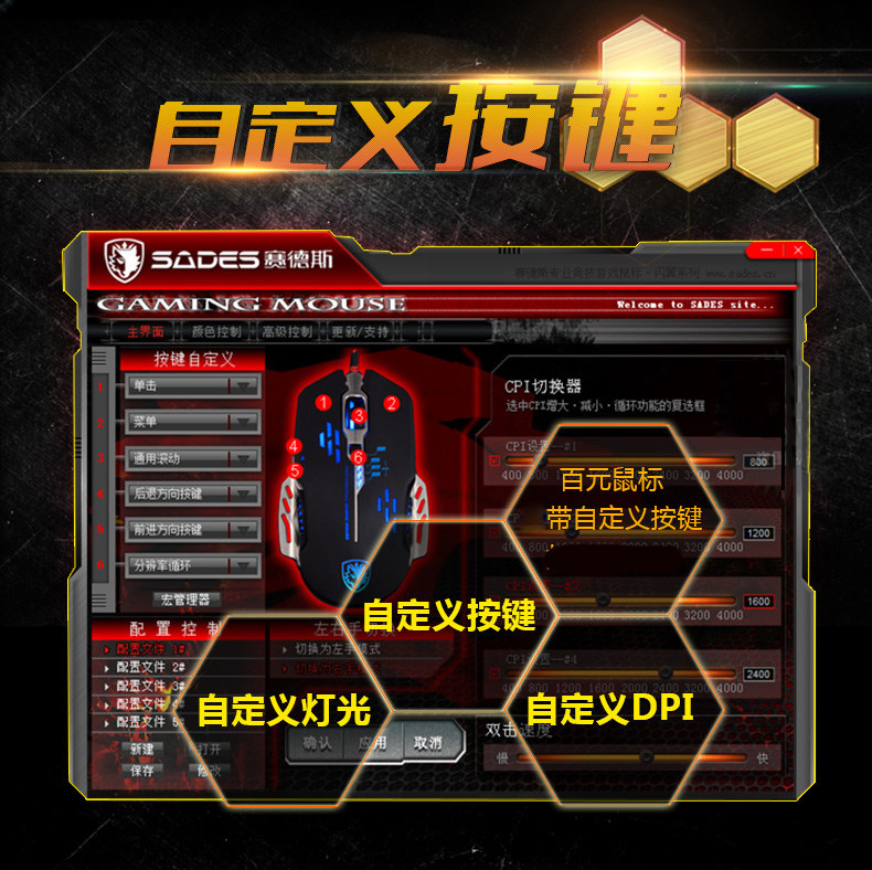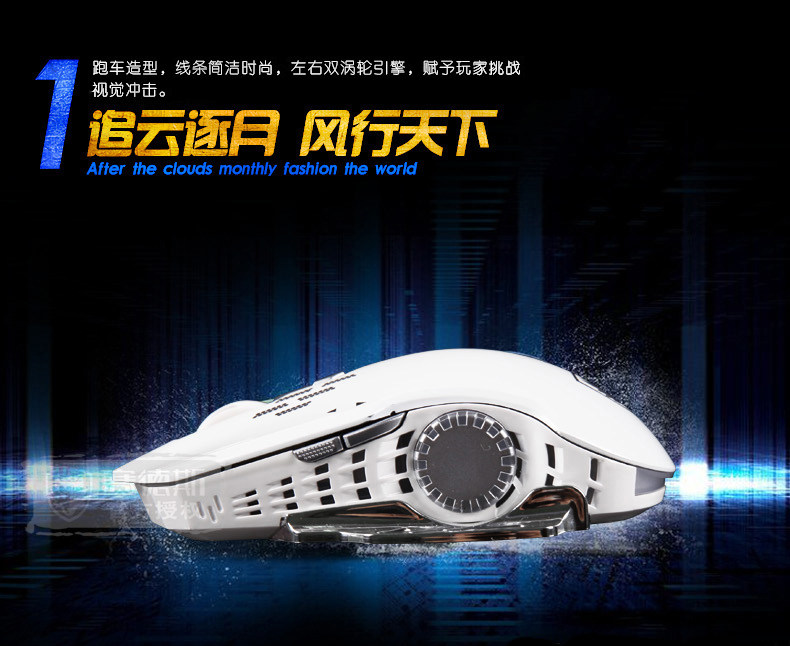 理由三:自主研发炫酷外观、符合人体工程学左右通用机械造型鼠标,拥有6种不同的背光灯,也可以设置为单色背光灯(默认6色循环呼吸也可以关闭背光灯),还可以设置每种炫光对应每档分辨率,精准识别;