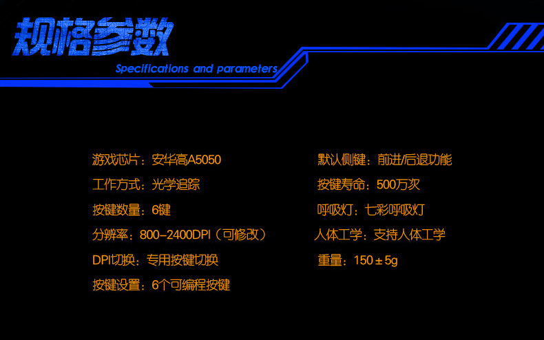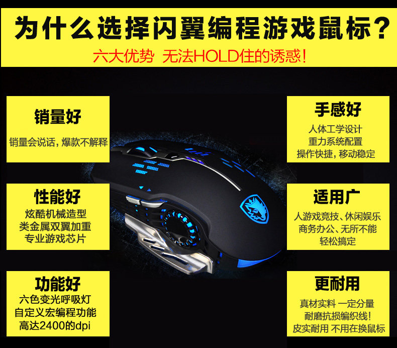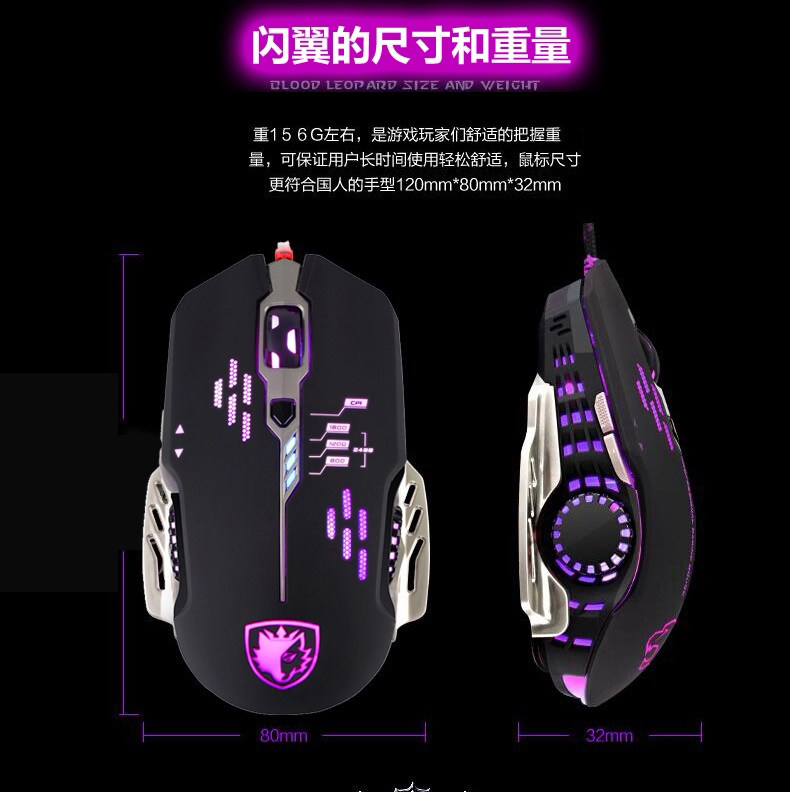 理由八:鼠标采用专业游戏USB接口,抗磁环,5倍耐拉扯的编织线,线长1.8米左右,鼠标重量156克左右,尺寸为120*80*32MM适用任何品牌电脑及系统(包括苹果笔记本电脑)!