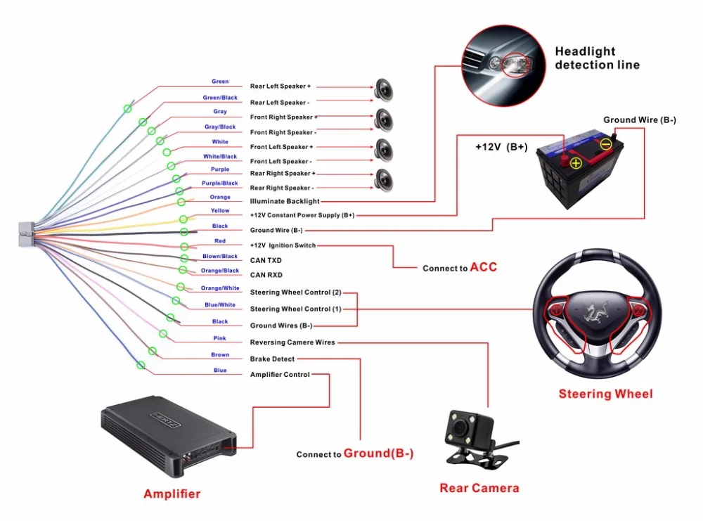 13.Support rear view camera input; vehicle information display, reversing trajectory