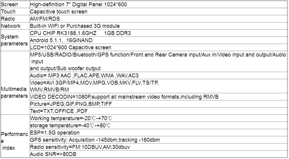 Androidu0026nbsp;5.1.1+Dual-core+GPS+BTu0026nbsp;function+WIFI+Supportu0026nbsp;phoneu0026nbsp;linku0026nbsp;function+FM/AM+Supportu0026nbsp;rearu0026nbsp;viewu0026nbsp;camerau0026nbsp;input+Supportu0026nbsp;HDu0026nbsp;screenu0026nbsp;