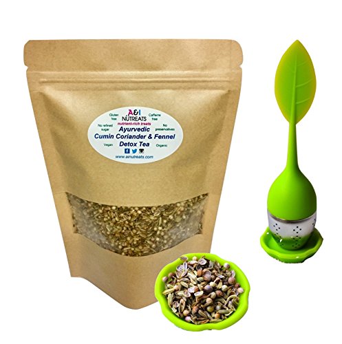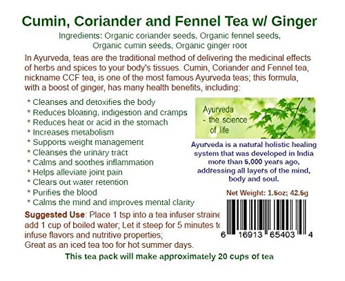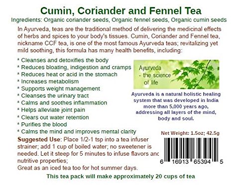 -. Feature : Cumin, Coriander and Fennel Tea, nicknamed CCF tea, has long been known as an Indian tea to improve digestion. / Calms the mind and improves mental clarity. In Ayurveda, this tea is known for balancing your doshas: vata, pitta, and kapha. / Cleanses and detoxifies the body; Increases metabolism; Supports weight loss. / Caffeine Free, Non-GMO, No preservatives, Gluten free, Vegan, Organic, No refined sugar, Soy free / Comes with a BPA-free silicone & stainless steel infuser. This tea pack will make approximately 50 cups of tea, using 1 tsp per cup.