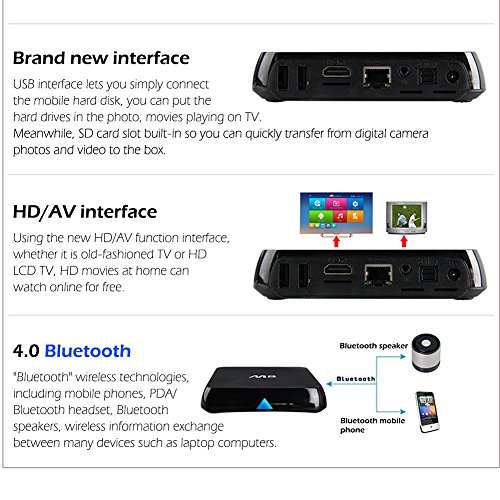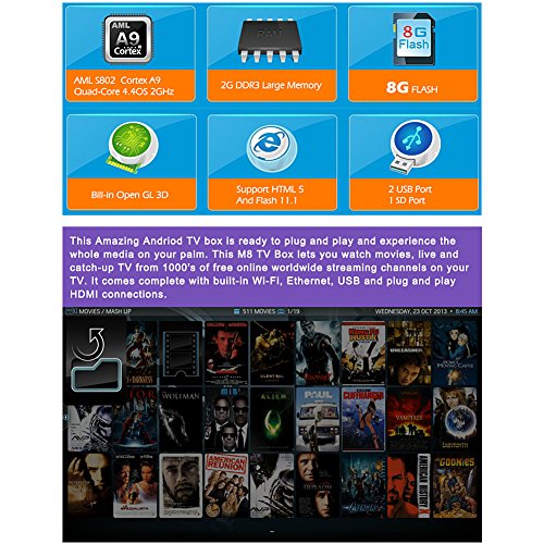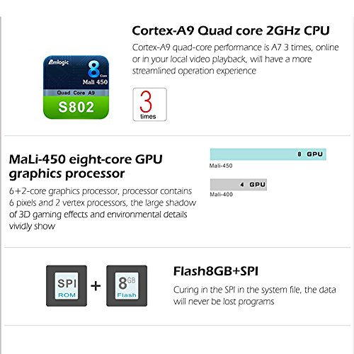 Cortex-A9 Quad Core Amlogic S802 CPU, Up to 2.0Ghz, Mali-450 GPU, faster than the rockchip rk3188 quad core tv box! Built-in 2GB RAM and 8GB Storage, support external (max 64GB) micro sd card expanded and USB hard drivers;Support 802.11B/G/N wifi and bluetooth v4.0