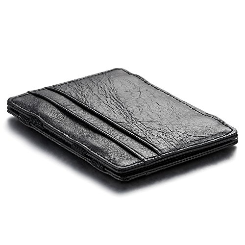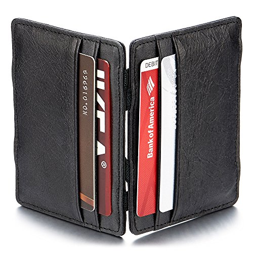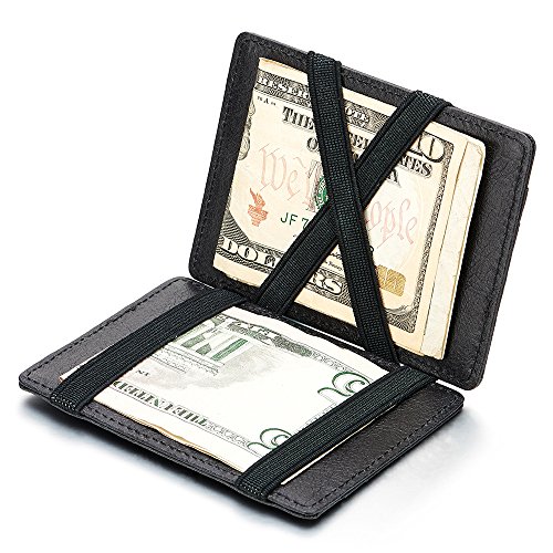 Product Description *Material: Genuine Leather; Color: Black *Measures: 4.21x3.19x0.39inch *Double-sided flip over design. Offers 4 card slots and 2 rubber band money clips *Slim thin. Perfect to slip into your pocket, briefcase or handbags *Timeless style for both men and women