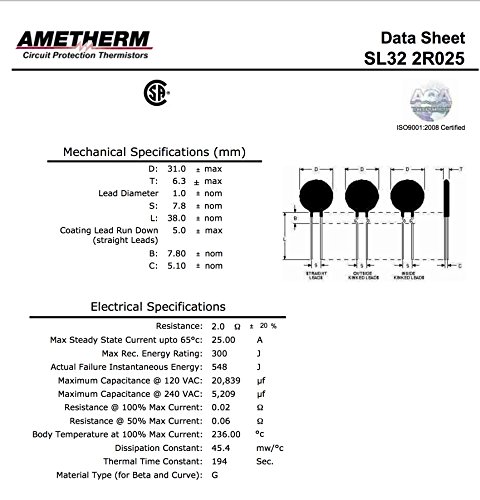 Ametherm SL32 2R025 (Pack of 2) Aqua-Rite Thermistor, ICL 2 OHM 20% 25A 30MM