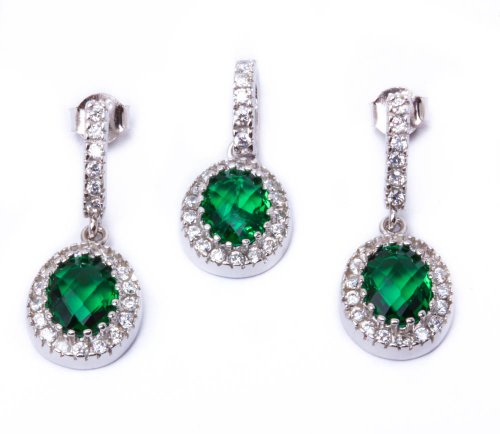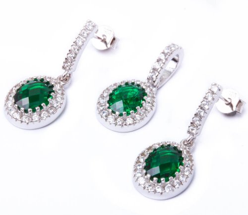 -. Title : Oval Simulated Emerald & Cz .925 Sterling Silver Earring & Pendant Jewelry set