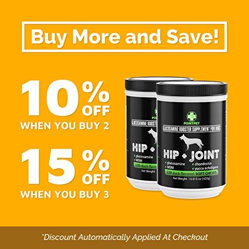 GREAT TASTING DOG ARTHRITIS SUPPLEMENT - Hundreds of satisfied dogs are barking about the duck flavored hip and joint dog treats. Instead of forcing tablets down your poor dog's throat, simply give them these irresistible glucosamine treats for dogs. Your dog once again can enjoy pain free morning jogs, or energetic games of fetch in the yard.