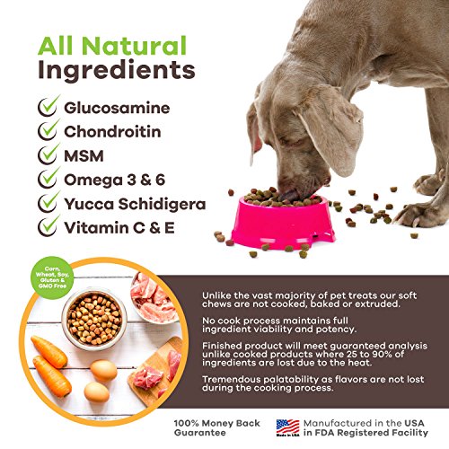 ALL-NATURAL DOG JOINT SUPPLEMENT WITH THE MOST ACTIVES PER ONE CHEW - 300 mg Glucosamine HCL, 100 mg Chondroitin Sulfate, 150 mg MSM, Omega 3 and 6 Fatty Acids with added Vitamins C and E and Yucca Schidigera Powder. Just think how much goodness is wrapped up in one soft chew for dogs. Transform your slow-moving pup to their former energetic self!
