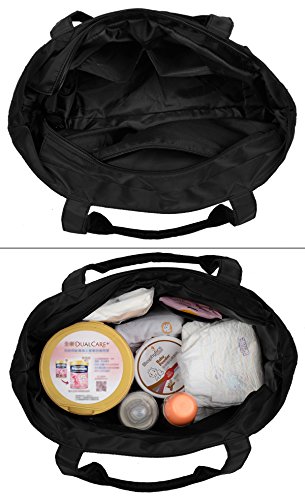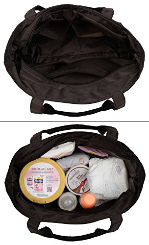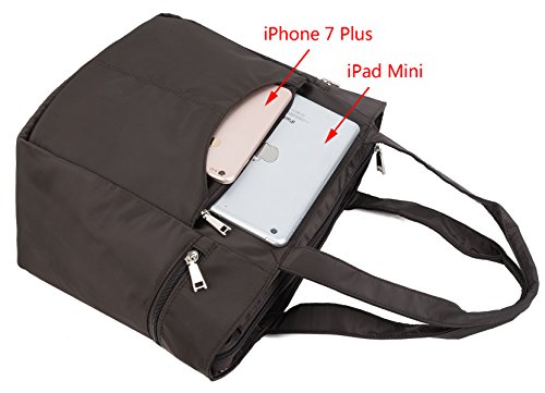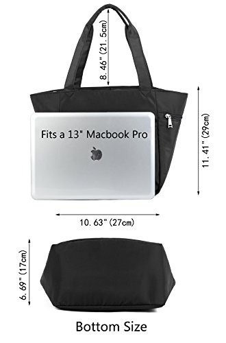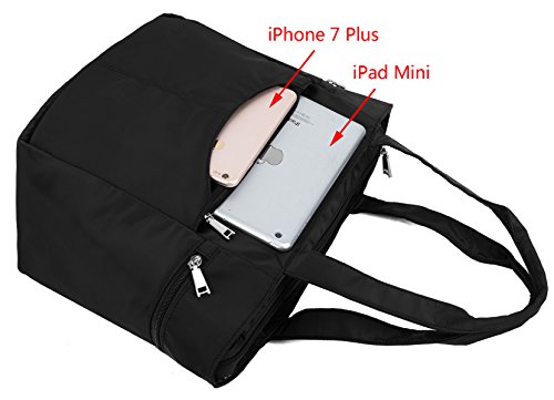 -. Feature : This nylon bag is made of super lightweight nylon, large capacity and durable for travel/daily. / Zipper top closure. This large tote can accommodate books, iPad, diapers, cosmetics, cellphone, charger, water bottle, wallet, lunch box and more. / 2 Front zipper pockets, 2 side pockets, 1 back zipper pocket, and 1 main compartment with 2 open pockets and 1 zipper pocket inside. / Handle drop is 8.46", easy to wear on your shoulder. Lightweight and pliable, a great carry-all for work, travel or leisure. / Dimensions: 10.63"x6.69"x11.41". Weight: 0.84 lb.