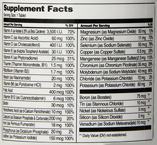 -. Feature : Multivitamin and multimineral formula recommended for adults under 50 / Compare to active ingredients in Centrum / Over 30 key nutrients for complete nutrition, including all RDI nutrients / No added sugar, yeast, preservatives or artificial flavors / One tablet daily