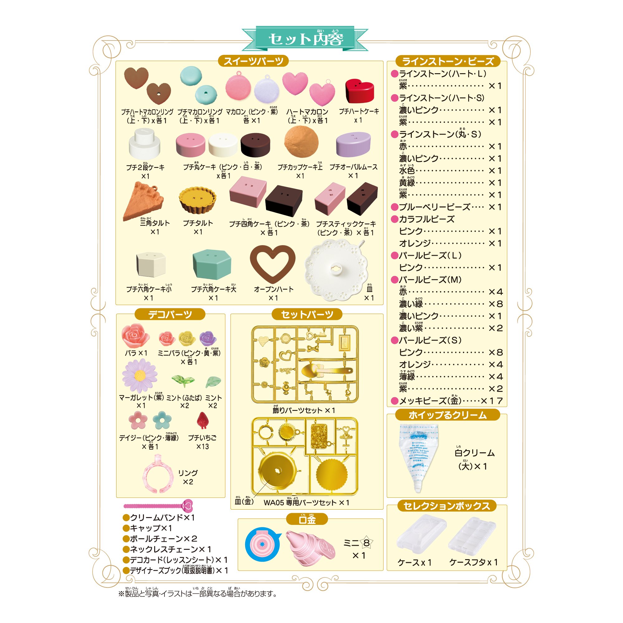 ● 23 parts of sweets (including gold parts) ● Various fruits ● Various flowers