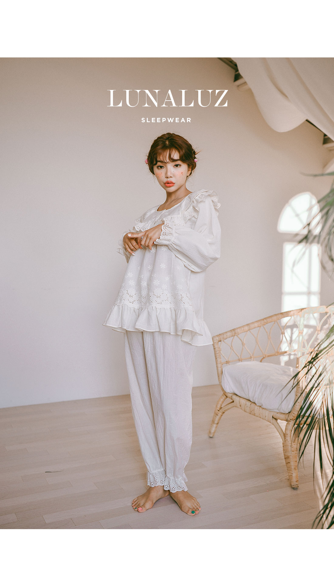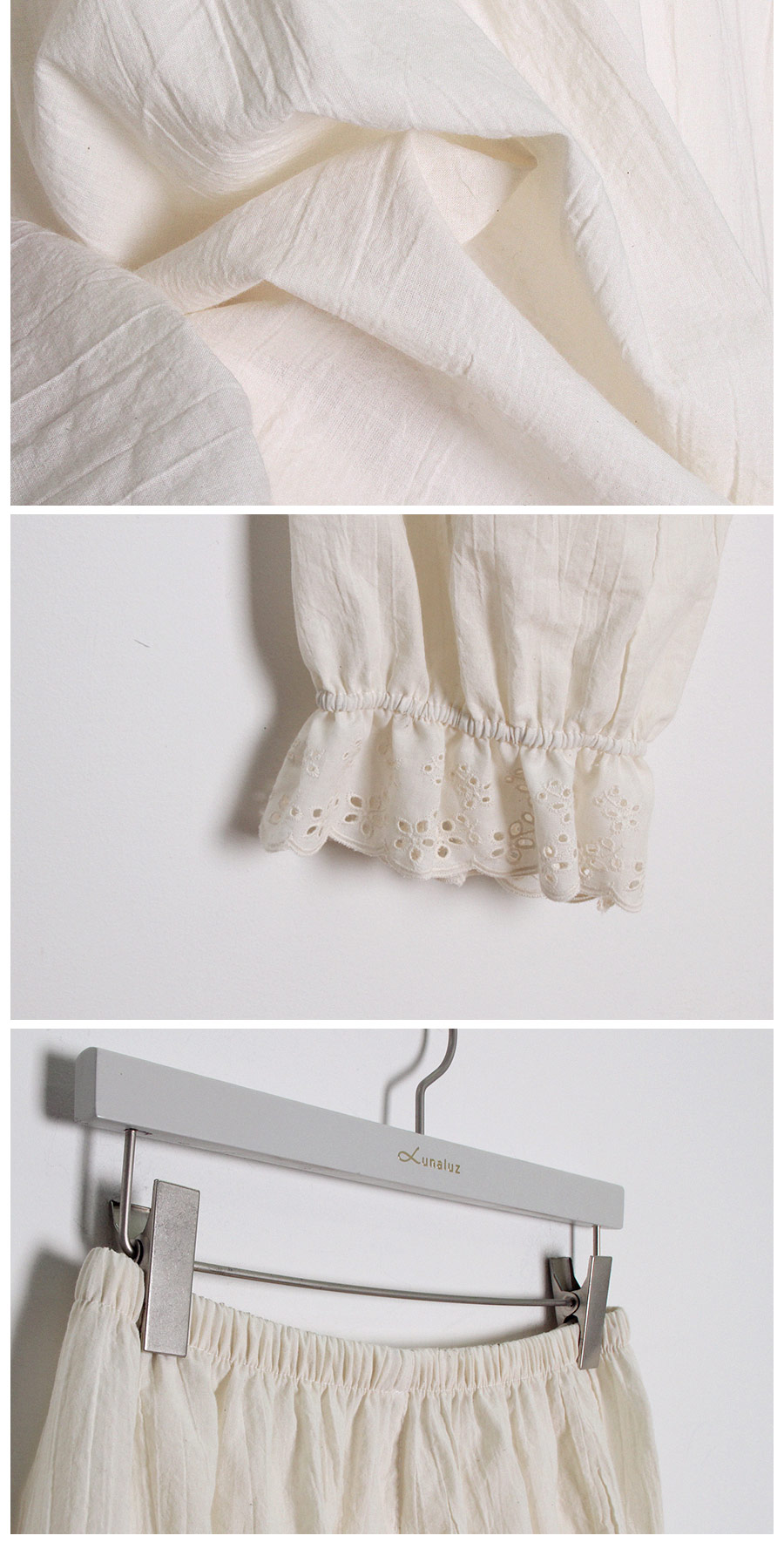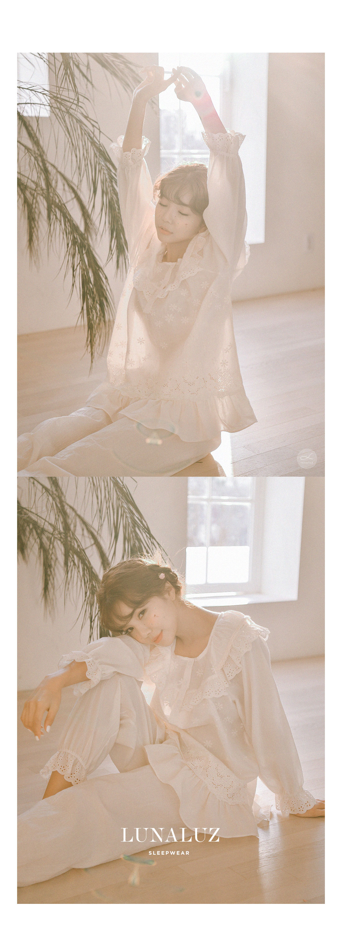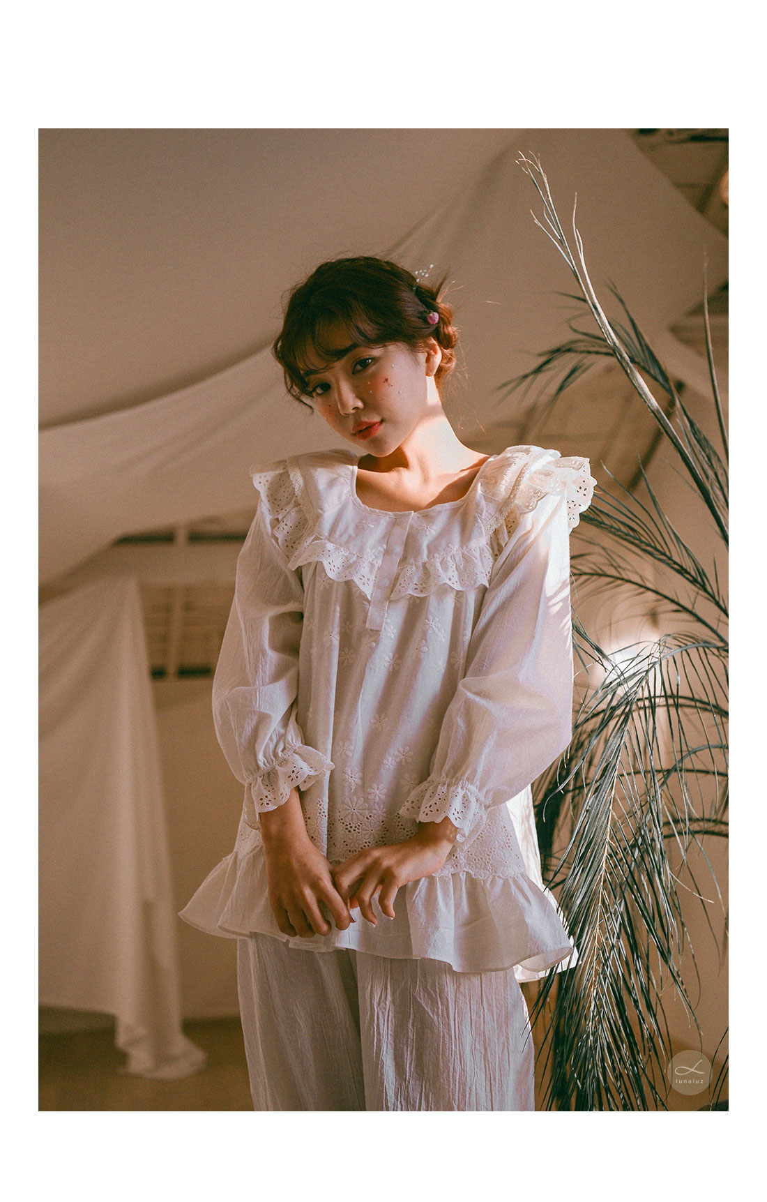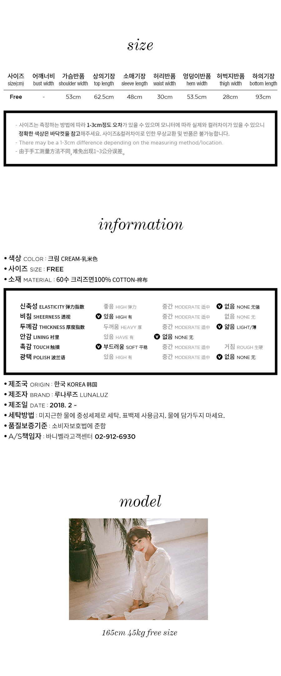 전체 플라워 자수를 짠 탄탄한 올오버 원단과 불규칙한 구김선이 매력적인 크리즈 소재의 믹스로 훨씬 감각적이고 로맨틱한 무드를 느끼실 수 있습니다. 크리즈 원단에 맞춰 올오버 자연적이고 네츄럴한 연베이지 컬러감의 잠옷으로 전 연령 두루두루 잘 어울릴 스타일이랍니다. 탄탄하고 고급스러운 소재감에서 우아한 분위기를 연출해보세요~! 크리즈가 잡혀져 있는 원단인 많큼 많은 요척을 사용한 잠옷으로 소재에서부터 충분한 매력을 느끼실 거에요! DETAIL 편안한 라운드 스타일로 래글런 패턴을 응용해 떨어지는 실루엣이 여유있고, 편안하며 여리한 느낌을 줍니다. 여리한 핏감이 체형커버에 탁월하며 슬림해 보이는 효과를 줍니다. 어깨선 없이 디자인된 잠옷으로 암홀의 절개선 없이 몸판과 소매가 이어지도록 디자인되었어요. 어깨선이 없이 매끄럽게 떨어지며 어깨 끝라인에는 잔잔한 토숀레이스와 면레이스를 동일한 연베이지컬러로 염색시켜 봉제했습니다. 바스트 라인과 소매 부분으로 이어지는 레이스 장식이 우아한 무드를 더해줍니다. 클로징을 길게 내려 탈착용이 쉽도록 제작했습니다. 드레스의 하단 부분에는 펀칭 올오버 원단이 한 층 더 매력을 더해줍니다. 뒤에서 보았을 때에도 , 여리하게 떨어지는 고급스러운 분위기를 보실 수 있을거에요. 고급스러운 소재 믹스와 고난위도의 패턴 작업이 이루어진 잠옷으로 적극 추천해드려요. 100% 국내 생산으로 봉제선이 깔끔하고, 디자인과 부자재, 소재의 퀄리티가 높습니다. SIZE 55~66반size까지 커버 가능한 free 사이즈입니다.