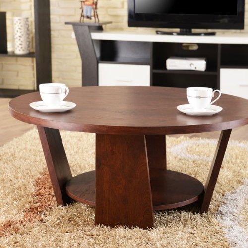 - Feature : Materials: Medium Fiber Board, Veneers; Finish: Vintage Walnut / Features an extra large round top and four-footed base create a dramatic appeal / One fixed shelf below for stowing away magazines and books / Simple yet stylish coffee table adds organization to busy family spaces / Overall Dimensions: 35" Dia x 15"H; Shelf Dimensions: 20"Dia x 9"H