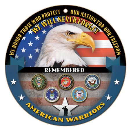 (SJT15431) We Will Never Forget - American Warriors - Bald Eagle on Flag 10" Round Wood Plaque Sign