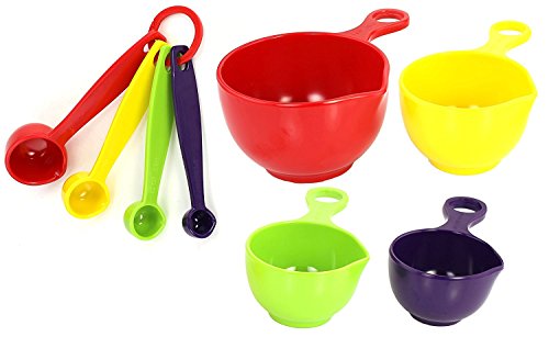 Melamine Plastic Fun Red Purple Yellow Green Measuring Cups and Spoons Set with Silly Bands