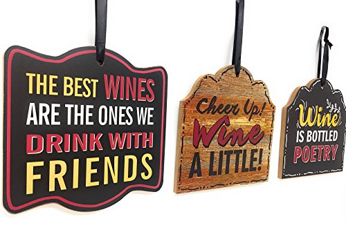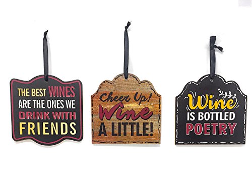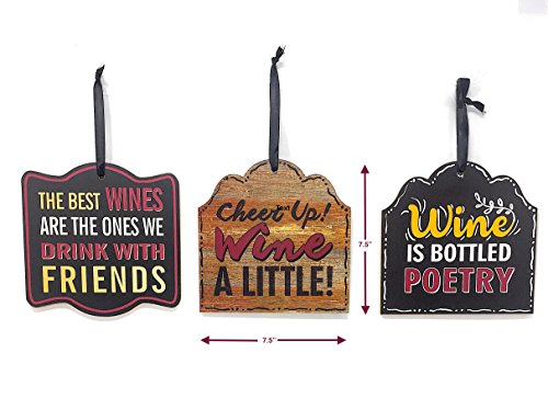 RUSTIC DÉCOR VINTAGE ART: These stunning vertical hanging signs have wine inspirational lyrics etched into them 'Cheer Up Wine a Little,' ' The Best Wines are the Ones We Drink with Friends,' and 'Wine is Bottled Poetry' for an eye-catching look