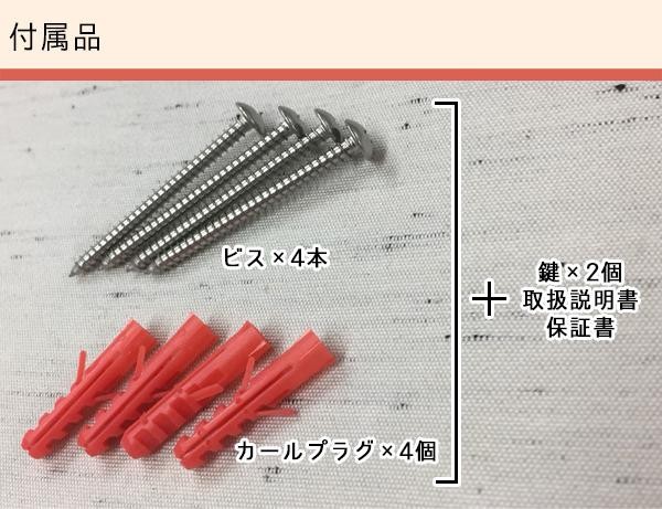 | 付属品 | ビス×4本、カールプラグ×4個、鍵×2個、取扱説明書、保証書(保証期間:1年間) |