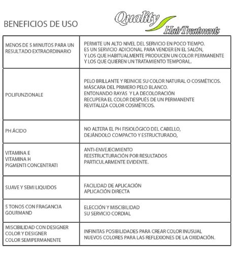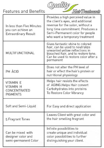 -. Feature : A revitalizing treatment that intensifies and prolongs the color of your hair. / Excellent for all hair types espically ideal for damaged and dry hair . / Contains complex botanical protenis designed to deposit nutrients, conditions,and restore pigment to the hair.
