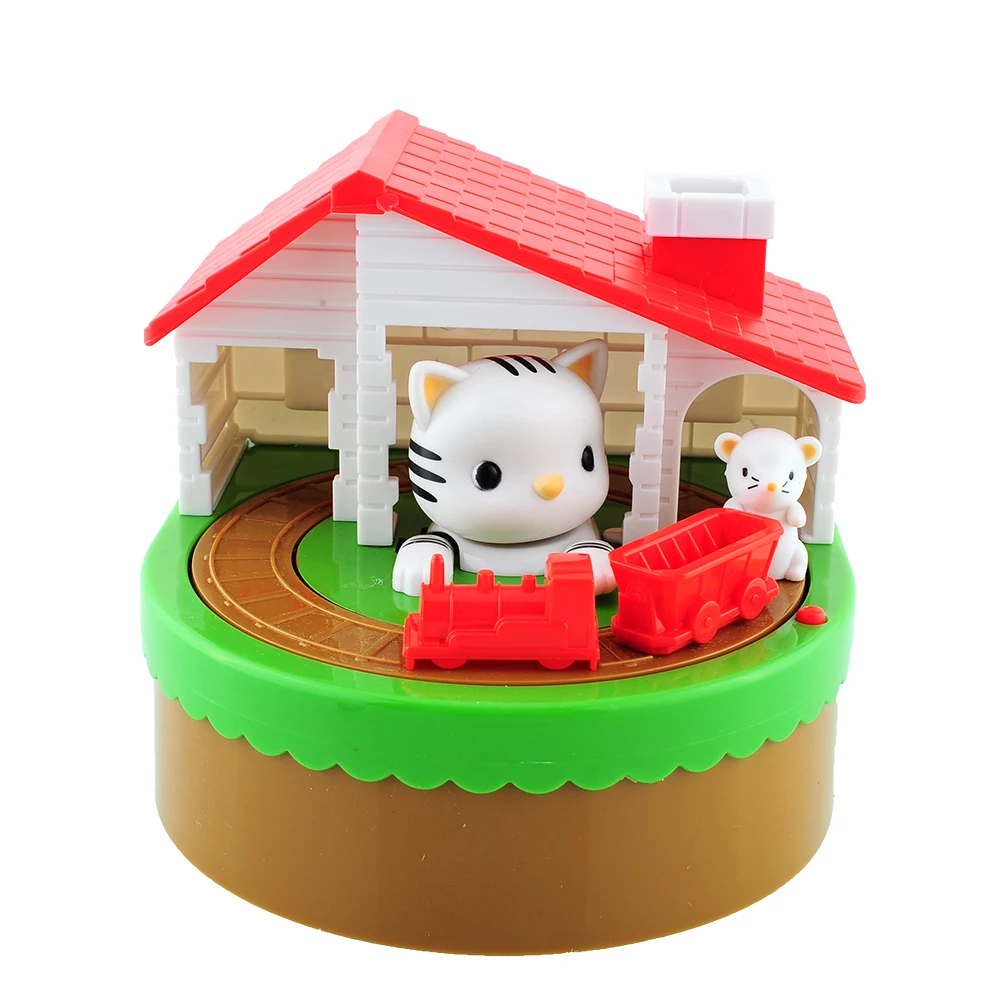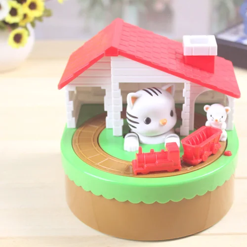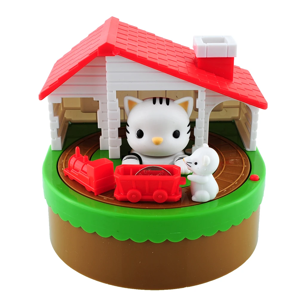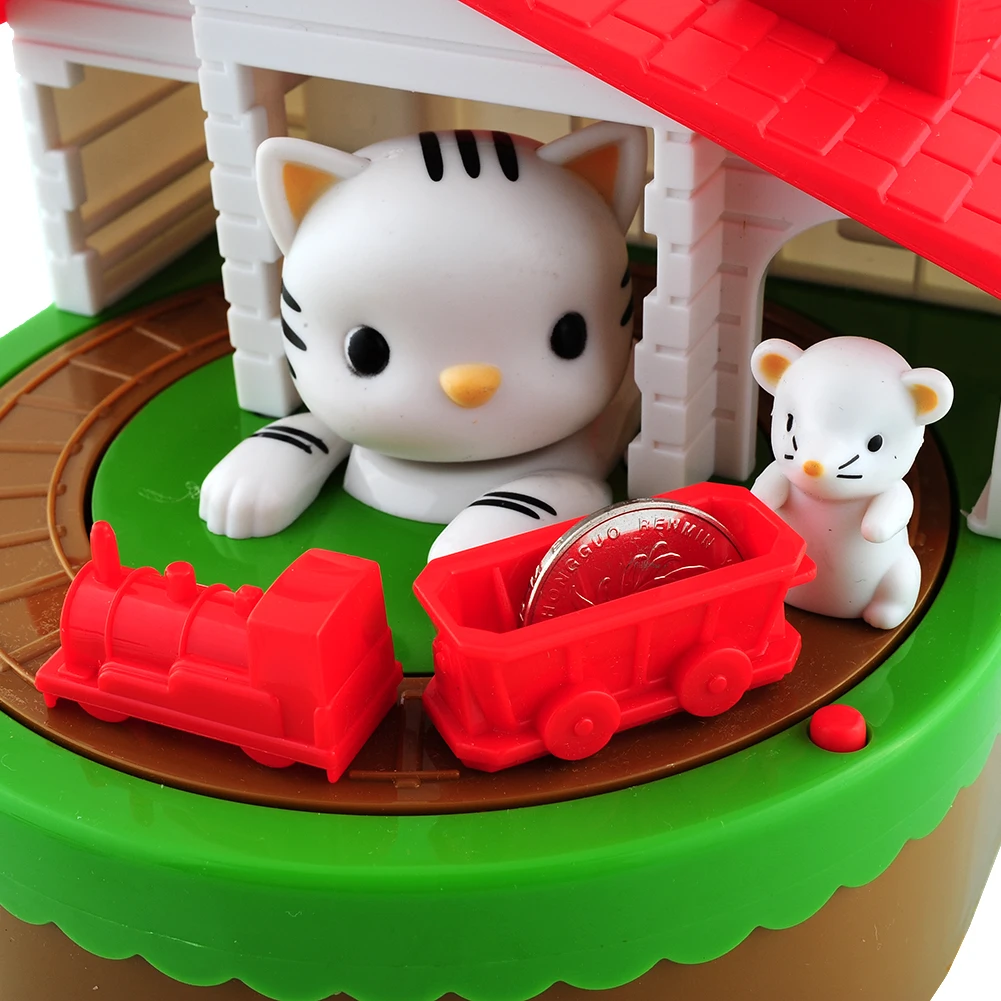 Put coin on the cart, long press the red button, the mouse will push the the car around the track with music, and the cat is trying to catch the mouse, very interesting and happy for your children to save money.