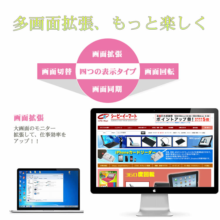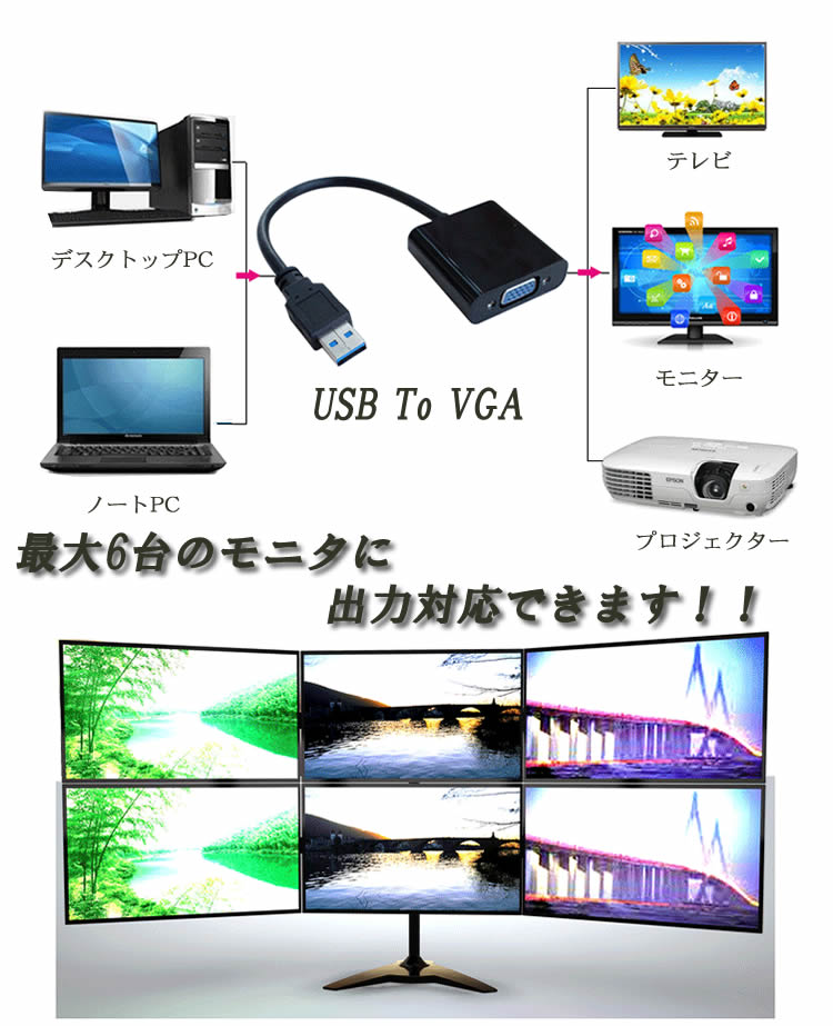 USBポートに接続することにより、パソコンのディスプレイ出力端子 が1つしか無いパソコンでもUSBポートからVGA出力を増やすことが出来ます。