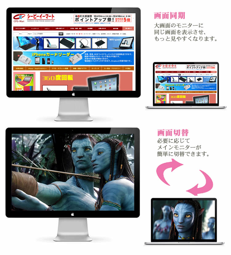 1台目のモニターから6台目のモニターに同じ画面を表示できます。プレゼンなどで大変活躍します。