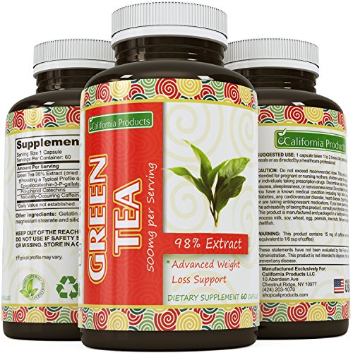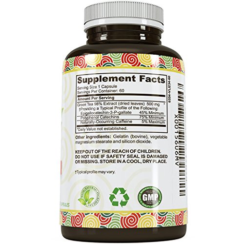 These pure and natural Green Tea Extract pills can help support your weight loss plan by acting as an appetite suppressant and metabolism booster. These extra strength capsules provide 500 mg of Green Tea 98% extract, which may help with losing weight. Some also use it as an aid to reduce the risks of hypertension, and studies have even shown that the polyphenol in the product can improve cognitive function. Green tea also includes antioxidants, and can also act an an anti-aging supplement because it smooths out wrinkles and hydrates the cells underneath the skin. Our products are all manufactured by GMP certified facilities in the United States, so you can be sure of their purity and quality.Feature
