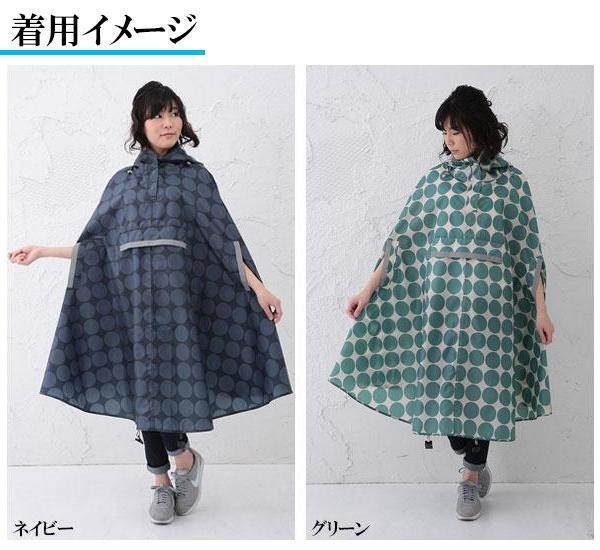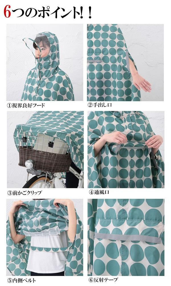 視界良好の窓付きフードや着用したままでも動きやすい手出し口、前かごに裾を固定できる前かごクリップ、ムレにくくなる通風口、ばたつきを抑える内側ベルト、夜間などにも便利な反射テープなど、6つの機能を搭載。便利なサイクルレインコートです。 |