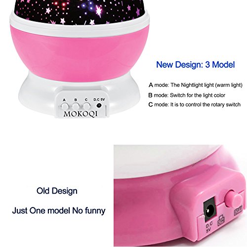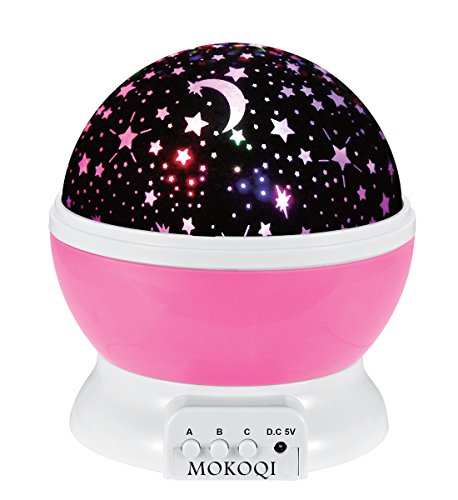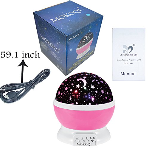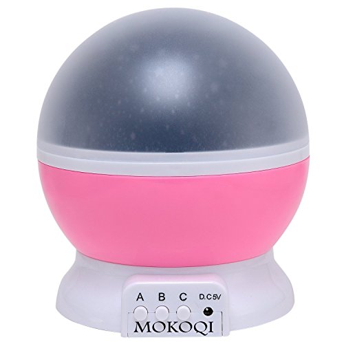 Studio : MOKOQI Publisher : MOKOQI Binding : Baby Product Product Description Specifications: Color: Blue, Purple, Pink Material: Plastic Switch Type: 3 Push-Button Voltage: 5V Product Size: 120*120*135mm Package Size: 130*130*135mm Light Source: 4 LED Bulbs Package Content: 1 x Star Projector 1 x 59.1 Inch (1.5M) USB Cable Features: 1. Ideal for decorating wedding, birthday, parties. Great for romantic night lamp and decoration light use!! 2. Best for home, bedroom, children rooms. 3. Very romantic night, full of sincere gift 4. Power by 4 x AAA battery (Not Included) or USB cable. 5. Energy power saving and environmental Friendly 0