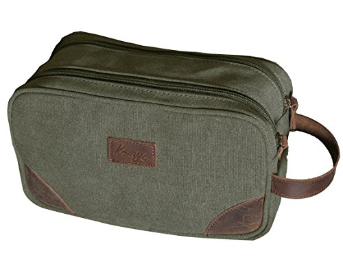 Mens Canvas Toiletry Bag Rustictown Bathroom Bag Genuine Leather Womens Cosmetic Makeup Organizer Shaving Dopp Kit Toiletries Case for Traveling Large (Military Green)