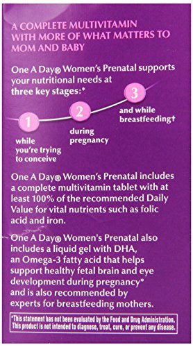 Studio : One A Day Publisher : One A Day Binding : Health and Beauty Product Description If you're pregnant, thinking about becoming pregnant or breastfeeding, you may need additional nutrients to support your baby's health in addition to yours. One A Day Women's Prenatal is a complete multivitamin product designed specifically for you with Omega-3 DHA and high levels of nutrients like iron and folic acid. This statement has not been evaluated by the Food and Drug Administration, This product is not intended to diagnose, treat, cure, or prevent any disease. 0