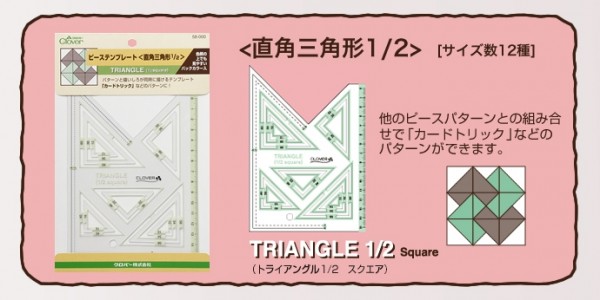 ピースドキルトのお手伝い。お好きなサイズのパターンが作れます。布や紙などの作図をしたいところにピーステンプレートを置いて、必要なパターンサイズをなぞります。ワンパッチなどの作品作りに便利です。他のピースパターンとの組み合わせで「カードトリック」等のパターンができます。 |