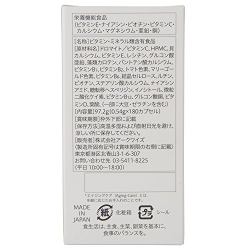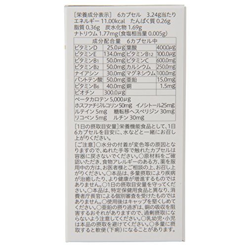 ビタミンD:25μg、ビタミンE:134mg、ビタミンB1:50mg、ビタミンB2:50mg、ナイアシン:30mg、パントテン酸:50mg、ビタミンB6:40mg、ビオチン:300μg、葉酸:400μg、ビタミンB12:100μg、ビタミンC:600mg、カルシウム:250mg、マグネシウム:100mg、亜鉛:15mg、銅:1.5mg、ベータカロテン:5,000μg、ホスファチジルコリン:50mg、イノシトール:25mg、ルテイン:5mg、糖転移ヘスペリジン:30mg、リコペン:5mg、ルチン:30mg