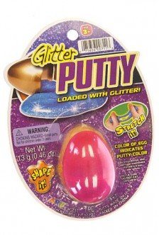 -. Feature : It's glittery pink, solid-liquid goo! / This play putty is loaded with shiny silver glitter. / Open the resealable Egg to shape, stretch and bounce this retro toy.