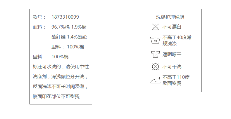 96.7%棉 1.9%聚酯纤维 1.4%氨纶 里料: 100%棉