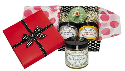 Gift Set of 3 all-natural organic sugar scrubs + a green-tea round konjac sponge. Scents include EnchantMint (Peppermint), Lavender Soul (Lavender & Fir) & Tropical Rendezvous (Citrus)
