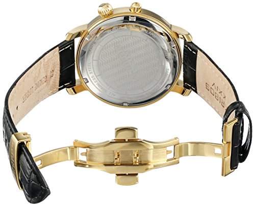 - Feature : Silver-tone, guilloche design, dial surrounded by gold-tone, Roman numeral, hour markers on the outer dial / Multifunction features include 60 second, alarm indicator and power reserve sub dials as well as a date window at the 6 o'clock position / Black, genuine leather, strap / Swiss quartz movement / Water resistant to 330 feet (100 M): suitable for snorkeling, as well as swimming, but not diving