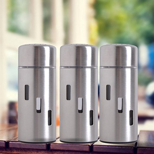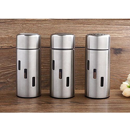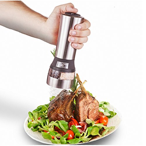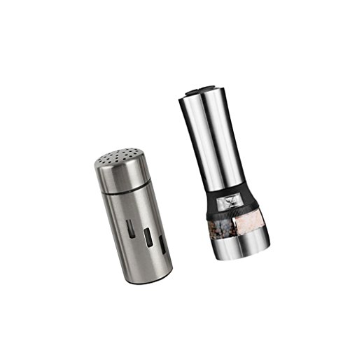 - EFFORTLESS TOUCH BUTTON: Relieve wrist strain and impress dinner guests with a touch of a button. - With the easy to use one-handed button, you can effortlessly enjoy the pure flavor of your freshly ground spices and herbs. - With chambers for both salt and pepper, this is the only mill you'll need to fulfill your seasoning requirements. - Perfect use for salt, pepper and powdered sugar Specification: - Material: Stainless Steel Acrylic - Color: Silver - Mill Grinder Shaker Size: Approx.7x21.5cm/2.76x8.46inch - Salt Pepper Shaker Size: Height: Approx. 128mm / 5.04inch, Diameter: Approx. 50mm / 1.97inch, Inner Diameter: Approx. 45mm / 1.77inch - Electric mill grinder power supply: 6 AAA batteries (not included).