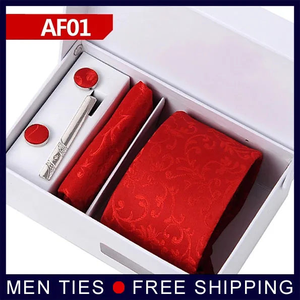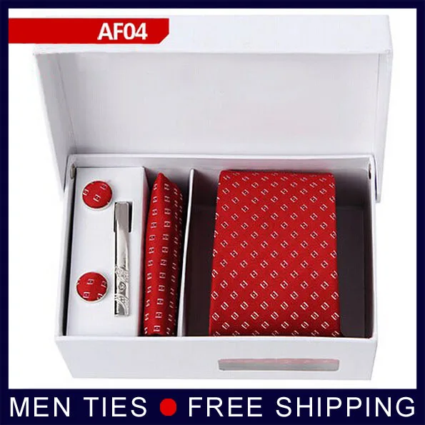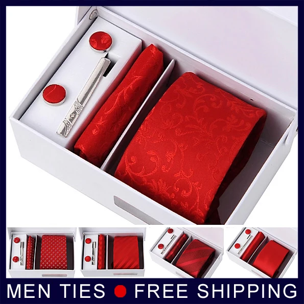 | [해외]남성 클래식 비즈니스 넥타이 세트 웨딩 선물 자카드 무늬 스트라이프 망 넥타이 세트 7 센치메터 커프 링크 손수건 타이 클립 상자 레드 |