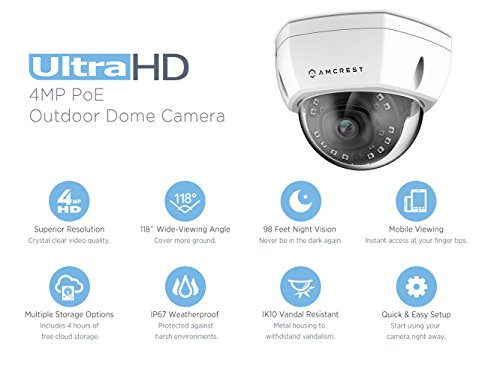 Superior HD 4 Megapixel Video Resolution at 30fps with latest Ambarella Chipset. Record and Playback using an Amcrest or ONVIF NVR, FTP, or Blue Iris. Optional Amcrest Cloud Video Recording service is also available.
