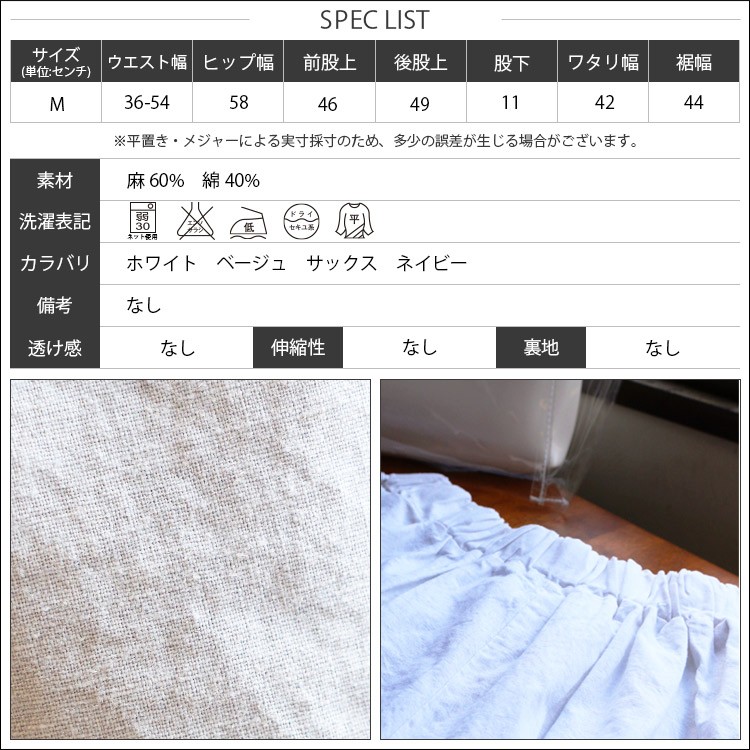実寸:ウエスト幅 36-54cm ヒップ幅 58cm 前股上 46cm 後股上 49cm 股下 11cm ワタリ幅 42cm 裾幅 44cm