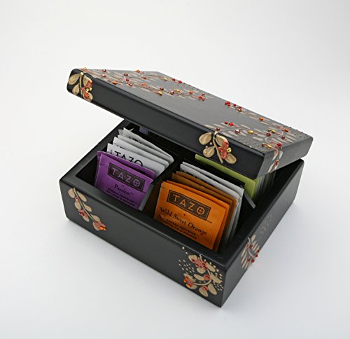 Measures 7.5" wide by 6.25" deep by 3.5" tall. This Tea Box has been designed to save space on your dining table due to its small footprint. Offers a wide selection of tea in a compact shape!