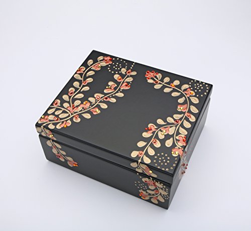 This elegant tea box has been meticulously hand painted with golden vines and coppery flowers. Set with dozens of Swarovski Crystals for an elegant sparkle! Hinged. Hinged in back with two brass hinges.