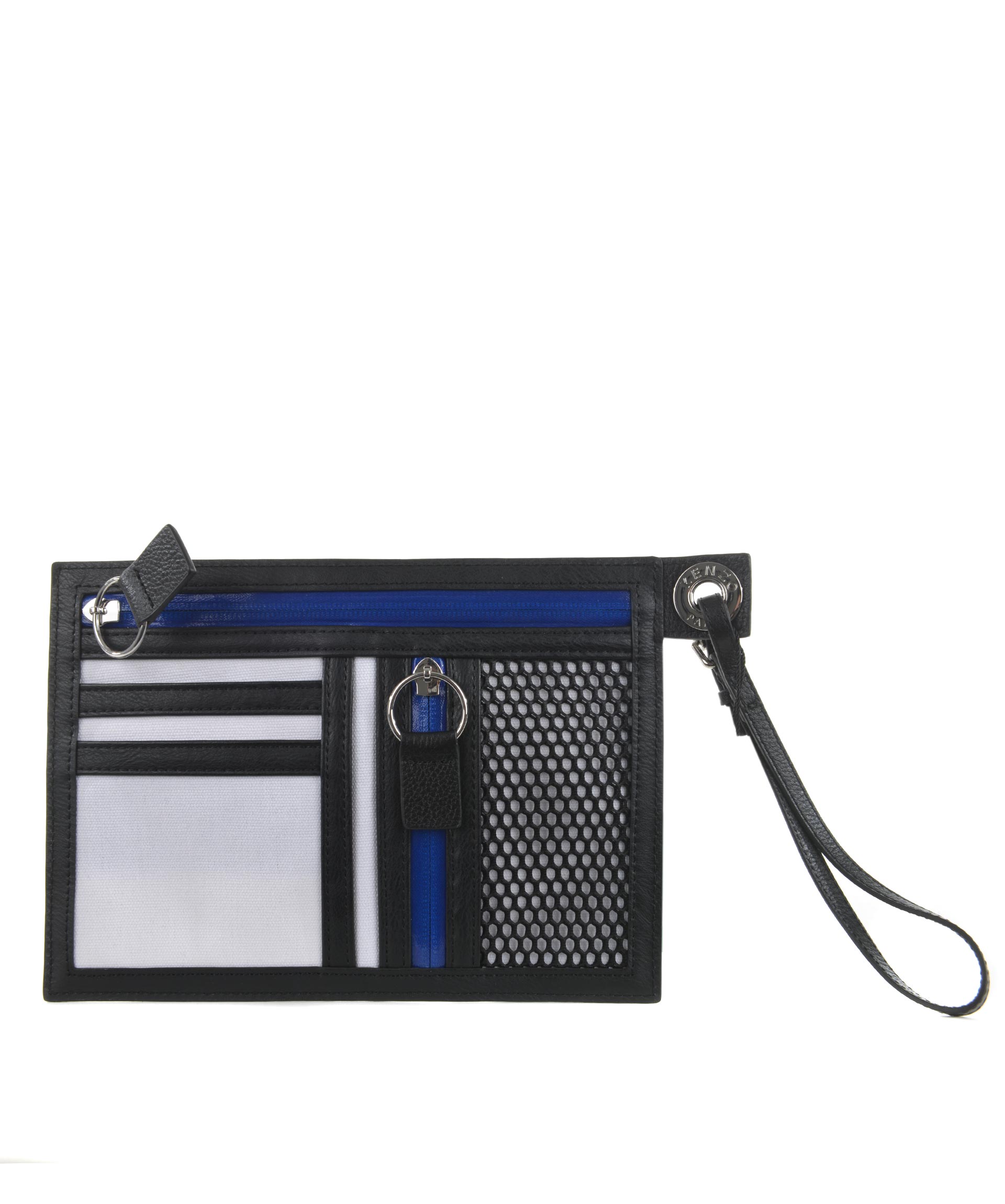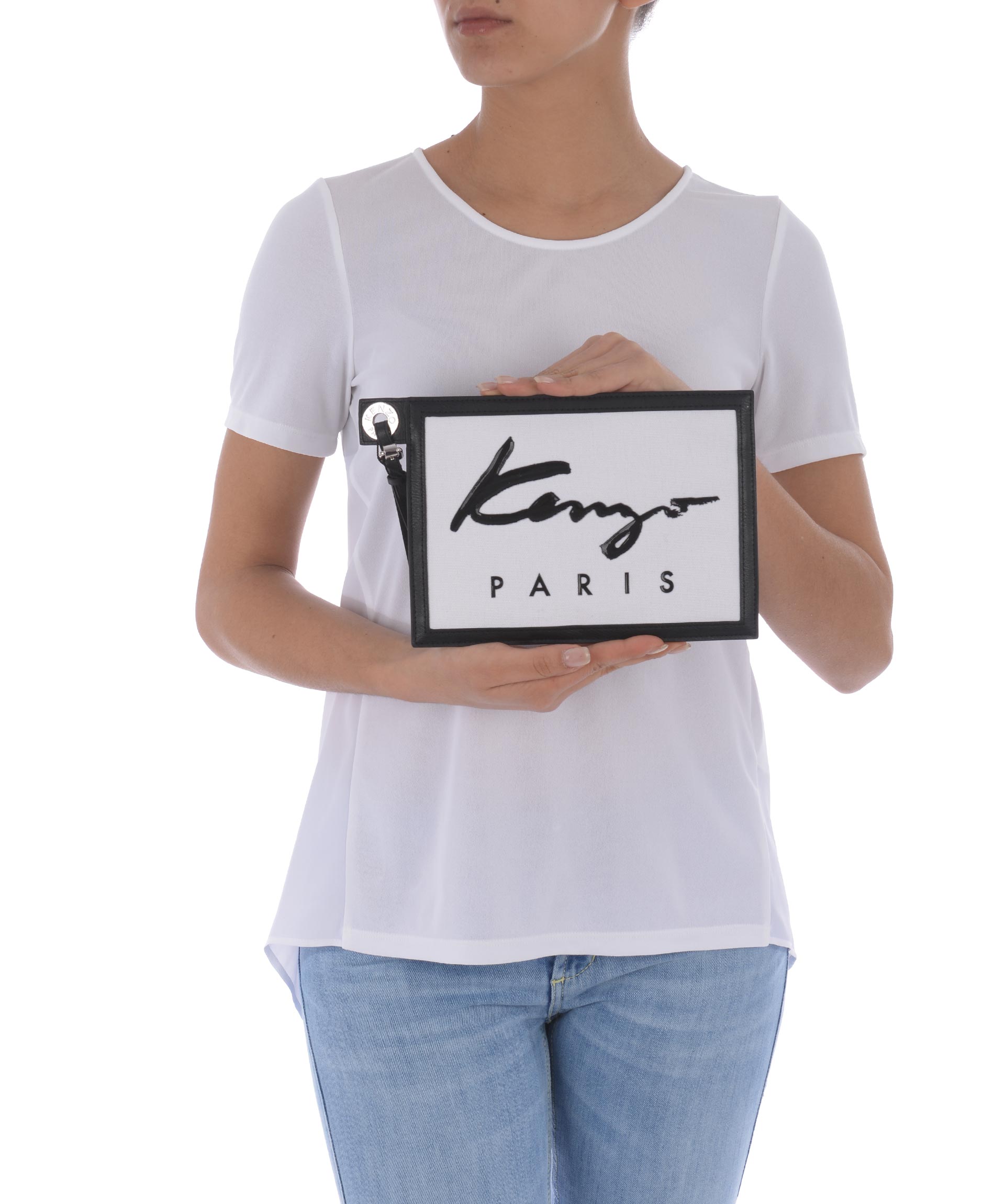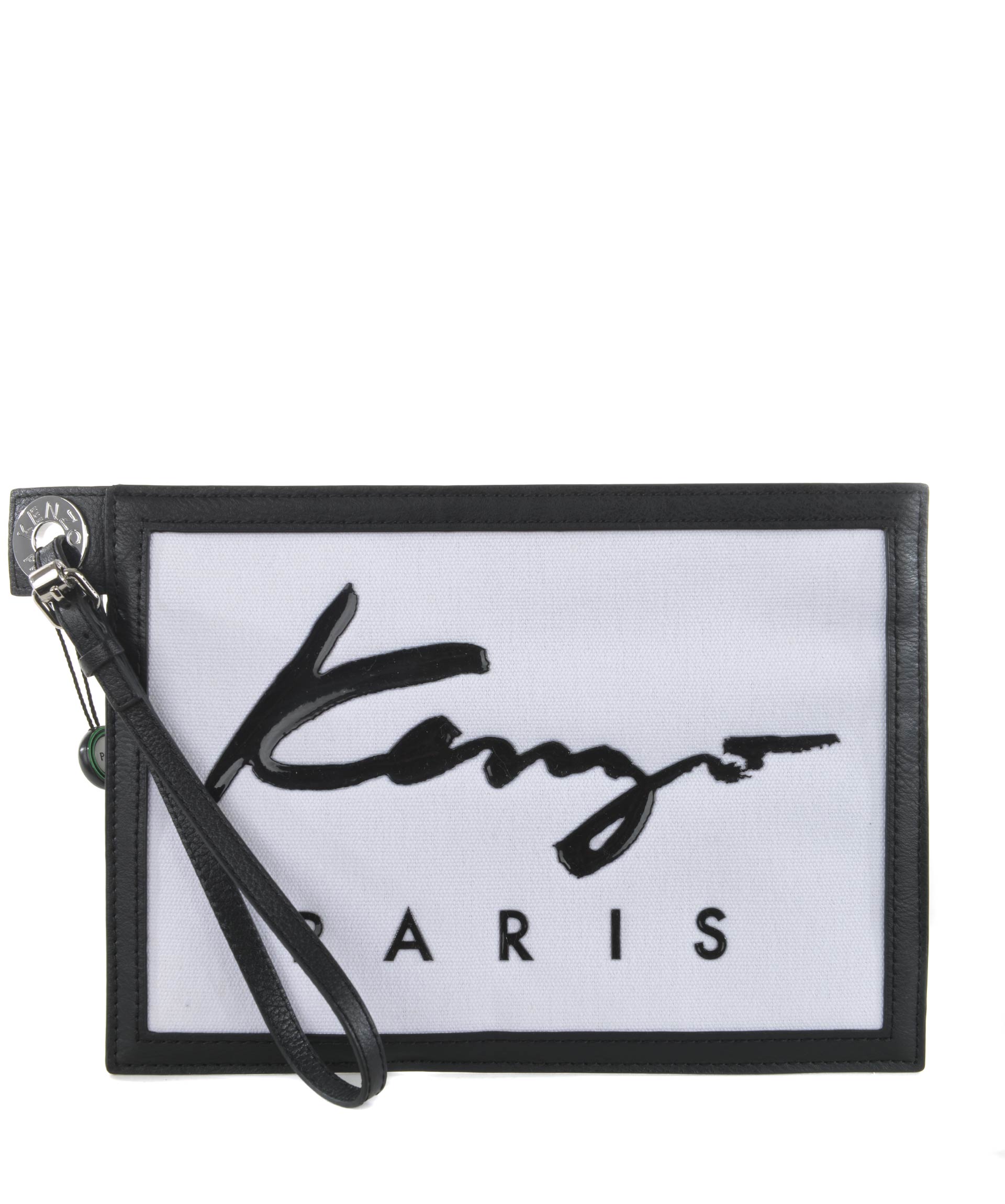 Pochette Kenzo in tela Bianca. Logo "signature" in silicone Nero. Manico in pelle removibile. Chiusura con zip. Multitasche. Profili in pelle. Dettagli in gomma a contrasto.