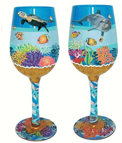 Studio : 95 and Sunny Publisher : 95 and Sunny Binding : Kitchen Product Description 95 and Sunny - Wine Glass "Underwater" Bottom's Up This collectible wine glass has touches of hand painting over a silk screening. Some glasses may have dimensional painting and or crystal accent stones. It has a pulled stel and holds 15 ounces. Each glass is packaged in a gift box. The decorative wine glass is a practical present that is useful and displayable. Care instructions: Hand wash ONLY, Do not use in mocrowave. Do NOT soak. 0