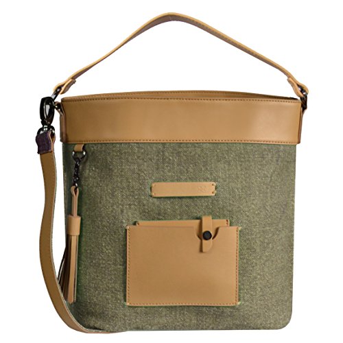 Crossbody and handbag with adjustable, removable strap. Features include genuine leather accents, one external zipper pocket, a detachable tassel, credit card holder and a wristlet wallet.