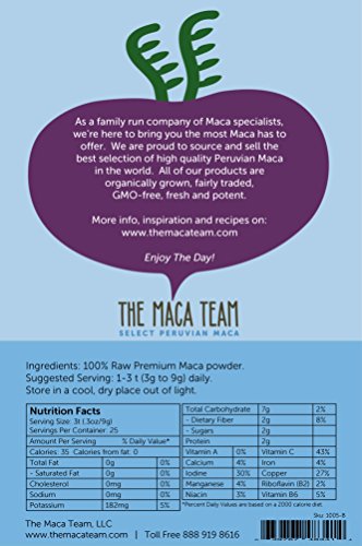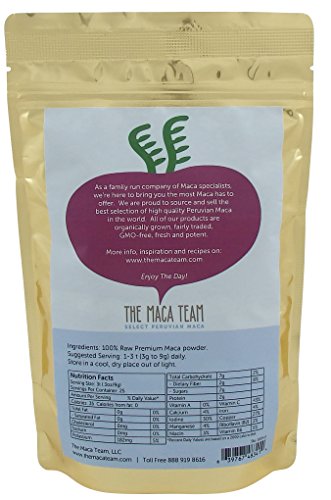 Our Premium Maca powder is made using a unique process. Instead of being sundried after harvest, the fresh roots are immediately cleaned, ground into a pulp and low temperature dried to produce a powder, which is then vacuum sealed in foil bags. This careful and quick handling preserves more vital nutrients of the Maca roots and makes for a significantly more potent product. In particular Raw Premium Maca is higher in glucosinolates, macaenes and macamides, some of Maca root's most important nutrients associated with hormone balance. Our Premium Maca powder contains a combination of about 30% Red, 40% Yellow and 30% Black Maca roots. Given the special handling and combination of Maca colors, Premium Maca Powder is in our opinion the best all-purpose Maca for both Men and Women. Our Raw Premium Maca is never heated, certified organic and fairly traded. The Maca Team, LLC is dedicated to preserving and sharing high quality Peruvian grown Maca with the world. As a family run company of Maca specialists, we're here to bring you the most Maca has to offer. We are proud to source and sell the best selection of high quality Peruvian Maca in the world. All of our products are always organically grown, fairly traded, GMO-free, fresh and potent. We sell 8 different kinds of certified organic Maca, raw and gelatinized (pre-cooked), in a variety of sizes, in vegan capsules and extracts. Please see our seller profile for more details and links to our products. Thank you for considering The Maca Team. Enjoy your day!Feature