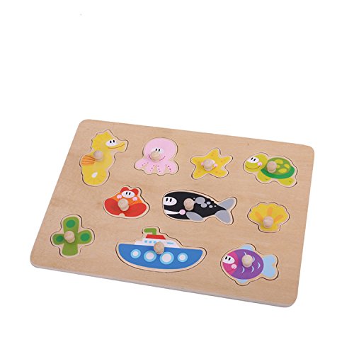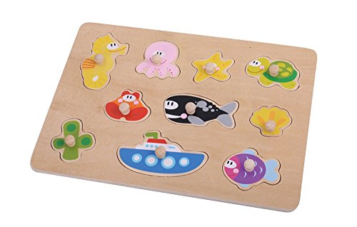 10-piece wooden puzzle featuring sea animals, sea grass and submarine.Drove to the sea to visit whales, crabs, clownfish, octopus, starfish shells, turtles and hippocampus